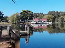Prior to European settlement the area was occupied by the Djadja Wurrung people. Pastoralists occupied the Jim Crow and Upper Loddon districts following white settlement in 1838. A farming protectorate was established at Franklinford, but was short-lived and by 1863 most of the survivors had been moved to Corranderk station at Healesville.[5] In 1848, Irish immigrant John Egan took up land on the future town site then known as Wombat Flat. He and a party of searchers found alluvial gold in 1851 on ground now covered by Lake Daylesford initiating the local gold rush. Other finds quickly followed. With the finding of alluvial gold a town site was surveyed and founded in 1852. Between 1851, and when Daylesford was declared a municipality and formed its first Council in 1859. The population had risen to approximately 7000 Men and women of all nationalities came to this town of muddy-streets and numerous hotels. Initially called Wombat, it was renamed Daylesford.[6] Agricultural activity quickly followed the miners, and many Chinese miners quickly turned to market gardening. The early Europeans, particularly Italians, established vineyards.
