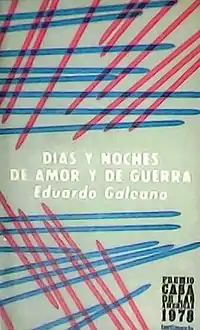 Days and Nights of Love and War (Spanish: Días y Noches de Amor y de Guerra) is a 1978 book by Uruguayan writer Eduardo Galeano. It was published in English translation in 1982 by Monthly Review Press.[1] Structured as a series of fragments, the book varies in tone from straight journalism to expressionism and poetic lyricism and in genre from short story to aphorism to biography.[2] It established the formal and thematic qualities of Galeano's prose,[2] and won the Casa de las Américas Prize in 1978.[3]