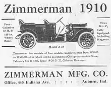 In Auburn, Indiana in November 1912, L.M. Field, Hayes Fry and Glenn Fry of Iowa City, Iowa, and V.H. Van Sickle and H.J. Clark of Des Moines, Iowa created the De Soto Motor Car Company. It was a subsidiary of the Zimmerman Manufacturing Company of Auburn, who had previously been at 440 North Indiana Avenue from 1908 until 1915. The Zimmerman Manufacturing Company was founded in 1886 as a manufacturer of horse buggies in Auburn. It entered automobile production in 1908 with a line of high wheel automobiles and 1912-1916 with light high wheel trucks, but switched to conventional cars and trucks around the time it was bought by the Auburn Automobile Company. Advertisements listed the 1910 Zimmerman Z-35 at $650 to $1,500 ($20,415 to $47,111 in 2022 dollars [2]).
