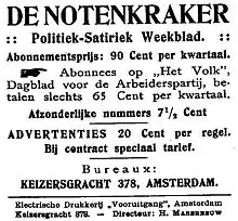 At the end of 1918 De Notenkraker has about 8000 subscribers, compared to about 30,000 for Het Volk and almost 40,000 SDAP party members. A subscriptions to Het Volk at that time cost 0.20 guilders per week or 2.50 guilders (a rijksdaalder) per three months. A subscription including De Notenkraker cost 25 cents per week, or 3.50 guilders per three months, 4.15 guilders in the Dutch East Indies.