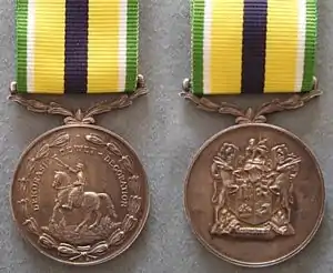 The decoration could be awarded to officers of the Commandos, the rural civil defence component of the South African Defence Force, for twenty years of efficient service and good conduct. Award of the decoration was made available to all ranks in 1986.[1][3][6]