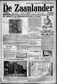 During World War II, De Zaanlander had collaborated with the German occupation, and on 4 May 1942 was merged with four other local papers from the region to form Dagblad voor Noord-Holland, under German editorial control.[4] After liberation it was banned from publishing,[2] until 23 September 1946.[5] Also in 1946, De Zaanlander is one of the co-founders of the group Verenigde Noordhollandse Dagbladen (VND), a group which will later become part of the Hollandse Dagbladcombinatie, part of the Telegraaf Media Group and responsible for the publication of the Noordhollands Dagblad.[6]