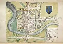 The text describes the town's walls with their four gates, the two crossing streets and the central market.[1][10][19] Lucian's observations often come from an imagined aerial perspective.[14][20] The text documents international trade, with ships carrying wine and other goods arriving at the port from Aquitaine, Ireland, Germany and Spain, as well as goods by land including grain, fish and cattle from England, Ireland and Wales, respectively.[1][2][10] Lucian makes an extensive comparison of Chester with Rome,[1][6][21] and also draws parallels with Jerusalem.[20] Outside Chester's walls, he describes three roads leading to Christleton (identified with Christ), Aldford and the sanctuary for criminals of Hoole Heath (the valley of demons).[22]