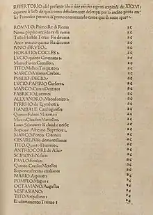 These are 36 biographies of Petrarch's subjects starting with Romulus, the mythological founder of Rome, and going through Trajan.[3] All of these are mentioned in Petrarch's epic poem Africa. He revised the list many times over the years in different "plans." Some "Illustrious Romans" ended with Titus.[4] Another plan of "Illustrious Romans" added Julius Caesar as the twenty-fourth biography.[5] The adjacent 1476 Table of Contents introduction is old Italian and says something to the effect: Repository of the book here present where will be shown the chapters on 36 "illustrious men" whose deeds are extensively described by the honorable poet, Sir Francesco Petrarca, and beginning as appears below. Listed among these are Titus, Pompey, Scipio Africanus and Julius Caesar.