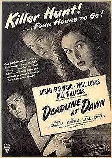 Deadline at Dawn is a 1946 American film noir, the only film directed by stage director Harold Clurman. It was written by Clifford Odets and based on a novel of the same name by Cornell Woolrich (as William Irish). The RKO Pictures film release was the only cinematic collaboration between Clurman and his former Group Theatre associate, screenwriter Odets. The director of photography was RKO regular Nicholas Musuraca. The musical score was by German refugee composer Hanns Eisler.[1]