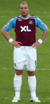 Ashton returned to the West Ham team on 14 July 2007 in a pre-season friendly against Dagenham & Redbridge where he played for 45 minutes. He admitted he had doubted whether he would ever return to top class football and was excitedly looking forward to next season, saying, "I don't think there will be a hungrier player in the Premier League this season than me".[29] He scored his first goals for a year in the pre-season matches against Leyton Orient[30] and Roma.[31] He made his return to the Premier League on 11 August 2007 against Manchester City, coming on as a substitute for George McCartney in the 65th minute,[32] and went on to make 35 league and cup appearances in the 2007–08 season, scoring 11 goals,[33] most notably an overhead kick against Manchester United. Ashton signed a new five-year contract at West Ham in June 2008, keeping him at the club until 2013.[34] Ashton started the 2008–09 Premiership campaign in blistering form, scoring both goals in the 2–1 home win against Wigan. However, he quickly found himself back on the Hammers' burgeoning injury list after spraining his ankle in manager Gianfranco Zola's first training session.[35]
