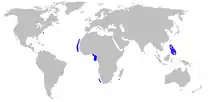 It is found in the Pacific Ocean around the Philippines, in the Western Atlantic Ocean off of the Carolinas, in the Eastern Atlantic all along Africa's west coast, and in the Indian Ocean off South Africa.