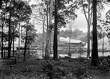 After the Government Trading Concerns Act 1912 was passed in December of that year, several State-operated businesses were established.[2] One of these was State Saw Mills, which commenced with purchasing the South-West Timber Hewers' Co-operative for £80,000.[3] Construction on the State's Number 1 sawmill, later called Deanmill, began in 1913, as did construction of the Number 2 and 3 mills at Big Brook, later called Pemberton.[3] The mills cost an estimated £138,000,[3] and were to provide timber railway sleepers for the Trans-Australian Railway.[2] Construction of the mills was delayed by heavy rainfall, and the railway sleepers were delivered late.[3] Other problems included shipping disputes and the Commonwealth government's price for sleepers.[3]