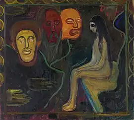 Upon request of the Munch museum in Oslo, which wanted to list the complete works of Munch and needed exact data,[7] the Bremen Art Society[8] let the painting be examined more closely. X-Ray images then led to the discovery that a second canvas of the same format with another painting of Munch was underneath the painting Death and the Child. This piece of art is unsigned and undated,[3] is from a time around 1895 to 1898 and shows a daintily seated act of a girl next to several big, brightly coloured mask-like heads and gripping hands. It bears the title Girl and Three Male Heads. The painting Death and the Child, purchased in 1918, was wound up on a new stretcher bar after this discovery.[6]