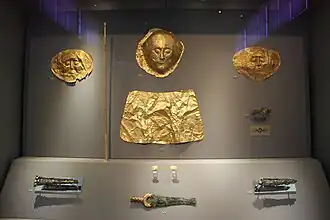 The death masks of Mycenae are a series of golden funerary masks found on buried bodies within a burial site titled Grave Circle A, located within the ancient Greek city of Mycenae. There are seven discovered masks in total, found with the burials of six adult males and one male child. There were no women who had masks.[1] They were discovered by Heinrich Schliemann during his 1876 excavation of Mycenae.