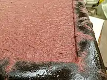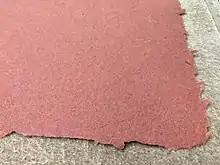A deckle is a removable wooden frame or "fence" used in manual papermaking. The deckle is placed into a mould to keep the paper pulp slurry within the bounds of the wire facing on a mould, and to control the size of the sheet produced. The mould and deckle is dipped into a vat of water and paper pulp that has been beaten (fibrillated). The pulp is quickly scooped out of the vat and the mould and deckle is shaken as excess water is drained off. The deckle is then removed and the newly formed sheet is "couched" (set) onto felts. Fiber that has been beaten longer generally requires more time to drain. If the paper slurry gets under, or if long fibers settles on top of the deckle, it will cause a more irregular edge.[1]: 119, 177–178