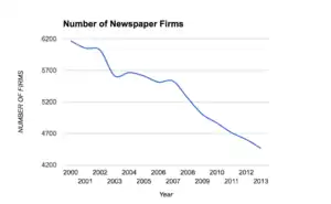 From 2005 to 2021, about 2,200 American local print newspapers closed.[14] From 2008 to 2020, the number of American newspaper journalists fell by more than half.[14]