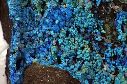Usually found as single pseudohexagonal platelets, often curved, and regularly measuring 10-50μm in size. It appears as royal blue to turquoise blue in colour, with a pale blue streak, and a pearly to vitreous lustre. Regarded as a supergene mineral which is believed to be formed through by mildly carbonated ground waters precipitating through the ore body. It is often associated with malachite, kamphaugite-(Y), donnayite-(Y) and caysichite-(Y)[2]