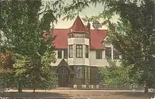 After moving from Masonic Hall, the classes were held at the Town House for one year until, in 1855, a new school was built on Highland Street and dedicated on December 10.[20][24] A new school was built on Bryant Street in 1887, and students moved in on October 3.[25][24] That building was 80' long and 77' wide.[24] After 1915, when the high school moved to Whiting Avenue, the building housed the Ames Junior High School, and today it is the site of the Dedham Town Hall.[25][24]