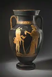 - ↑ "Amphora with Athena Pouring Wine for Herakles, and a Woman Pouring Wine for Dionysos". Los Angeles County Museum of Art. Retrieved 2 April 2020.
