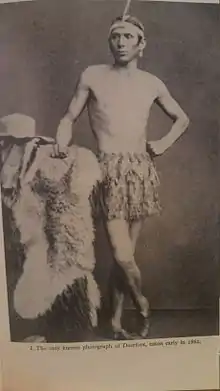 Much of Deerfoot's popularity was contingent upon his maintenance of his "savage" character. At his manager's prodding, Deerfoot would placate the most highly respected of viewers by several well documented acts. In the most famous of which, Deerfoot would sit at a bar with a guest of honor until late hours of the night, then allowed his entourage to watch him retire on his hotel room floor wrapped in a bear skin vehemently rejecting to sleep in the bed.[4] In other circumstances, Deerfoot was encouraged to deal out warrior-whoops to the public, of which stories grew dramatic and embellished.[4]