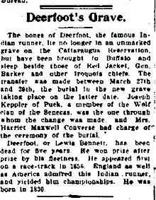 - ↑ "Deerfoot, the Fleet, Is No More; Noted Indian Runner Dies on the Cattaraugus Reservation". The New York Times. January 20, 1896. p. 1. Retrieved June 19, 2020.