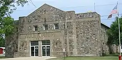 The Deerwood Auditorium is a large, rectangular, two-story building. It features reinforced concrete walls faced with split fieldstone and Moderne-style cast stone trim. A medium-pitch gable roof completes the building. The facility became home to Deerwood's city council, public library, fire equipment, and later the police department.[4] A gymnasium with a stage on the north end doubles as an auditorium. The second floor contains a balcony on either side of the auditorium, while the first floor also houses a kitchen and locker rooms.[5] These spaces allowed the building to be used for a variety of purposes. Sporting events, community meetings, plays, and banquets have all been held in the building.[4] Other events have included lectures, company meetings, exhibits, fraternal gatherings, and graduations.[5]