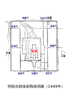 ![]() Map of Beijing in 1449. Esen's forces were facing the Deshengmen and Xizhimen gates from the North West corner of the map. | |||||||