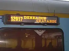 The Dehradun Shatabdi Express is an Express train of Shatabdi class belonging to Indian Railways that runs between New Delhi and Dehradun in India. It runs 7 days in a week. It operates as train number 12017 from New Delhi to Dehradun and as train number 12018 in the reverse direction.[1] Dehradun Shatabdi Express is part of series of Shatabdi Express trains called as 'superfast train' in India. These passenger trains operated by Indian Railways to connect Metro cities with other important cities of India.[2]
