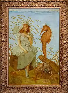 For example, while her Long Ago Girl (2018) is painted in the mische technique and is represented wearing 18th century garments, she is also positioned in a protective manner reminiscent of and illusory to “historic images of the Madonna of Mercy, where humanity kneels under the cloak of the Virgin Mary”.[5] Here, Sullivan-Beeman’s heroine is presented traditionally in terms of style and culture; she also draws on feminist ideals in that she posits the heroine as a protector figure of nature.[5] The artist’s imagery is often pulled from the subconscious awareness of femininity; a dream journal functions as the conception place for much of her work. Her heroines and their positioning in the context of the painting are also highly symbolic of inner knowledge, worth, and discovery: in Seahorse Girl (2018), the seahorse is a symbol of the heroine’s “benevolent protection,” while the treasure chest bullion represents the heroine’s inner “fortitude, knowledge, and wisdom”.[6]