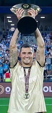During the summer 2019, Lovren demanded a transfer since he did not want to be a substitute. The strongest interest was expressed by Serie A clubs Milan[57] and Roma.[58] He was therefore left out of the squad for 2019 UEFA Super Cup, which Liverpool won beating Chelsea on penalties.[59][60] Lovren returned to the squad for an EFL Cup match against MK Dons on 25 September.[61] He went on to solidify his spot in the starting XI following Joël Matip's injury.[62] On 27 November, he scored the equalizer in the Champions League group stage match against Napoli, that ended as a 1–1 draw.[63] However, on 10 December, he suffered a knee injury in a game against Red Bull Salzburg and was substituted for Joe Gomez.[64] The injury forced him to miss the 2019 FIFA Club World Cup, which Liverpool won beating Flamengo 1–0 in the final.[65] He returned on 26 January 2020 and captained the team in an FA Cup game against Shrewsbury Town that ended as a 2–2 draw.[66] On 25 June, Lovren became the first Croatian to win a Premier League after Liverpool finished first place in the 2019–20 Premier League.[67][68]