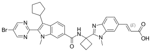 Deleobuvir (formerly BI 207127) was an experimental drug for the treatment of hepatitis C. It was being developed by Boehringer Ingelheim. It is a non-nucleoside hepatitis C virus NS5B polymerase inhibitor. Deleobuvir was tested in combination regimens with pegylated interferon and ribavirin, and in interferon-free regimens with other direct-acting antiviral agents including faldaprevir.
