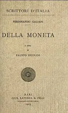 Della Moneta (On Money) is a 1751 book written by Ferdinando Galiani, and is considered one of the first specific treatises on economics, especially monetary theory, preceding Adam Smith's The Wealth of Nations by twenty-five years.