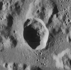 Delmotte is a small lunar impact crater that lies just to the east of the much larger crater Cleomedes, and to the north of the Mare Crisium, in the northeastern part of the Moon. Delmotte appears foreshortened when viewed from the Earth, although not sufficiently to obscure the interior details.