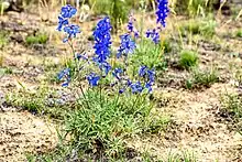 The wildflower author Claude A. Barr considered plains larkspur to be "arresting in the intensity and depth of its textured blueness." In gardens it has good drought resistance, but requires good moisture and soil to maximize its bloom.[4] It is on the City of Fort Collins' recommended plant list for its very low water usage and for its value as a nectar source for insects. However, the plants have limited availability in the horticultural trade.[23] Seed germination when planted outside in the fall is 57%, but drops to only 5% if not cold stratified.[24] Plants can be successfully transplanted, though like many plants this is more successful if done while plants are small and in dormancy with plenty of soil around the roots.[25] Plains larkspur is known to be winter hardy in USDA zone 4, a minimum temperature of about −34 °C (−29 °F).[26] Plains larkspur seeds were offered for sale as early as 1916 and regularly through the 1930s by Rockmont Nursery.[27][28]