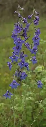 Delphinium treleasei, commonly known as named glade larkspur or Trelease's larkspur, is a perennial flowering plant found it temperate areas of the eastern United States.[2] It is native to Missouri and Arkansas[2] where it is often situated in limestone glades but is not common in North America. It is endemic to Ozark highlands in eight southwestern Missouri counties and eight counties in northwestern Arkansas. D. treleasei is a vascular, seed plant, part of the buttercup family (Ranunculaceae).[3] The name Delphinium treleasei originates from the Greek "delphis" which means dolphin in reference to the flower shape of many buttercups and the specific epithet "treleasei" honors William Trelease who was director of the Missouri Botanical Garden from 1889 to 1912.[4]
