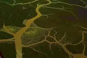 The interior of the Parnaíba delta contain large fields of mobile dunes, mostly with a NE-SW orientation. Some are partially stabilized by creepers and shrubs.[8] The dunes are unstable due to the action of tides, winds and rivers, and to recent movements of the crustal floor.[9] Average temperatures are fairly constant through the year, from 25 to 27 °C (77 to 81 °F). Annual rainfall is about 1,200 millimetres (47 in), with 80% falling from January to May. The driest period is from August to November.[10]