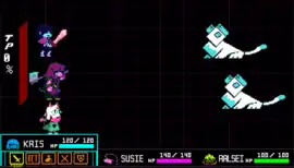 The game utilizes a turn-based combat system. Players can choose from a set of actions each turn such as fight, act, spare, use an item, or defend, which reduces incoming damage.[6] Brushing against attacks without touching them, defending, and hitting an enemy increases the tension points (TP) gauge, which allow party members to use spells or particular acts.[6] For example, Ralsei can pacify enemies by singing them to sleep.[8] When a party member's hit points (HP) drop below zero, they become downed and will not be able to fight until revived. The HP of downed party members will regenerate slowly until it reaches 1; any other healing source will also revive a downed party member.[6]