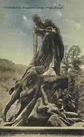 The fountain "The Deluge", with its biblical message, captured perfectly the dramatic stageof the events and aroused admiration. Located among the greenery of the park, it was the object of frequent visits during the traditional walk and quickly became a regular feature of the urban landscape. It became the hallmark of Bydgoszcz. "The Deluge" was dismantled on 7 January 1943, when occupying forces decided so, in order to melt down the 8870 of kg metal for war purposes. After World War II only remained the pool, in which the statue was replaced by four stone fish bubbling water, realized by Józef Makowski.[1]