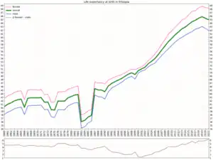 Ethiopia is the most populous landlocked country in the world.[18] Its total population has grown from 38.1 million in 1983 to 109.5 million in 2018.[19] The population was only about nine million in the 19th century.[20] The 2007 Population and Housing Census results show that the population of Ethiopia grew at an average annual rate of 2.6% between 1994 and 2007, down from 2.8% during the period 1983–1994. As of 2015, the population growth rate is among the top ten countries in the world.[21] According to UN estimations, life expectancy in Ethiopia had improved over time, with male life expectancy reported to be 56 years and for women 60 years.[22]