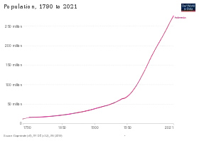 Despite a fairly effective family planning program that has been in place since 1967,[3] Indonesia's average population growth per year was over 1.1% for the decade ending in 2020, nearly having 13% population growth for that decade. At this rate, Indonesia's population is projected to surpass the population of the United States if the recent population growth continues.[4]