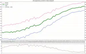 The median child birthing age was 30 and the total fertility rate is 2.1 births per woman in 2010. In Māori populations the median age is 26 and fertility rate 2.8.[24] In 2010 the age-standardised mortality rate was 3.8 deaths per 1000 (down from 4.8 in 2000) and the infant mortality rate for the total population was 5.1 deaths per 1000 live births.[24] The life expectancy of a New Zealand child born in 2014-16 was 83.4 years for females, and 79.9 years for males,[3] which is among the highest in the world. Life expectancy at birth is forecast to increase from 80 years to 85 years in 2050 and infant mortality is expected to decline.[25] In 2050 the median age is forecast to rise from 36 years to 43 years and the percentage of people 60 years of age and older rising from 18 percent to 29 percent.[25][n 3] During early migration in 1858, New Zealand had 131 males for every 100 females, but following changes in migration patterns and the modern longevity advantage of women, females came to outnumber males in 1971.[27] As of 2012 there are 0.99 males per female, with males dominating under 15 years and females dominating in the 65 years or older range.[28]
