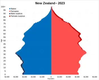 The 2018 census enumerated a resident population of 4,699,755 – a 10.8 percent increase over the population recorded in the 2013 census.[4] As of January 2024, the total population has risen to an 5,267,410 (estimated by extrapolation).[20] The population is increasing at a rate of 1.4–2.0 percent per year.[21] In May 2020, Statistics New Zealand reported that New Zealand's population had climbed above 5 million people in March 2020;[22] in September 2020, this was revised six months earlier to September 2019 when population estimates were rebased to the 2018 census.[23]