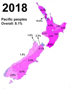As at the 2018 census, the majority of New Zealand's population of European descent (70 percent; often referred to as Pākehā), with the indigenous Māori being the largest minority (16.5 percent), followed by Asians (15.3 percent), and non-Māori Pacific Islanders known collectively as Pasifika (9.0 percent).[4] This is reflected in immigration, with most new migrants coming from Britain and Ireland, although the numbers from Asia in particular are increasing. Auckland is the most ethnically diverse region in New Zealand with 53.5 percent identifying as Europeans, 28.2 percent as Asian, 11.5 percent as Māori, 15.5 percent as Pasifika, and 2.3 percent as Middle Eastern, Latin American or African (MELAA).[6] New Zealand is considered by some to be unique among Western countries for its high levels of ethnic intermarriage,[7] which has historically been viewed with tolerance.[8][9][7] According to a 2006 study, Māori have on average roughly 43% European ancestry, although the notion of being "mixed-race" is uncommon.[10][11]