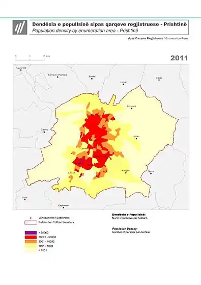 ![]() This map it shows population density by enumeration Area Prishtine 2011[1] | ||||