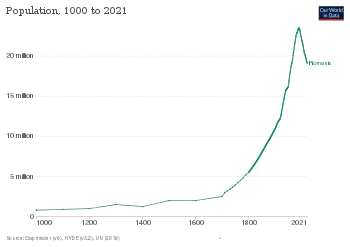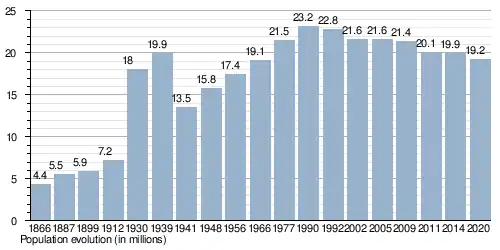 In 1990, Romania's population was estimated to be 23.21 million inhabitants.[10] For the entire period 1990–2006, the estimated population loss tops 1.5 million,[10] but it is likely to be higher, given the explosion of migration for work after 2001 and the tendency of some migrants to settle permanently in the countries where they live.[11]