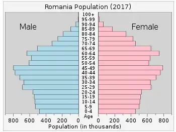 Romania's population has declined steadily in recent decades, from a peak of 23.2 million in 1990 to 19.12 million in 2021.[9] Among the causes of population decline are high mortality, a low fertility rate since 1990, and tremendous levels of emigration.[9]