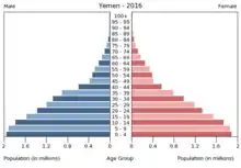 Demographic features of the population of Yemen (Arabic: سكان اليمن) include population density, ethnicity, education level, health of the populace, economic status, religious affiliations and other aspects of the population.
