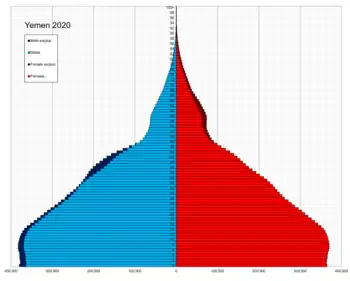 The population of Yemen was about 33 million according to 2021 estimates,[4][5] with 46% of the population being under 15 years old and 2.7% above 65 years. In 1950, it was 4.3 million.[6][7] By 2050, the population is estimated to increase to about 60 million.[8]