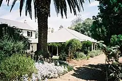 A Canary Island date palm (Phoenix canariensis) north-east of the house was planted in 1948 to commemorate a marriage in the owners' family.[1] The garden in summer is filled with the scent of old-fashioned roses - gallicas, bourbons, banksias, damasks, musks and rugosas and scented pelargoniums. Bushes of Rosa chinensis "Old Blush", a China rose are scattered through the garden. These were the first species of rose to be grown in the colony.[1] The Mediterranean cypress (Cupressus sempervirens) on the eastern side of the garden was reputedly planted by Hassall and the Hassall girls once played croquet in this part of the garden.[1]
