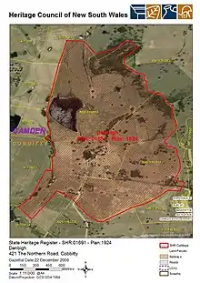 The physical evidence of Aboriginal occupation of the estate, both prior to and after European arrival backed up by documented evidence of this including ceremonial use, strengthens the integrity and rarity of the continuous physical record of the place. Important named historical Aboriginal figures such as Cannbaygal, a visiting chief from the mountains, are associated with the Denbigh farm, and possibly also Cogy (Cogrewoy) a leader of the "Cowpastures" Tribe who also acted as guide through the district to Macquarie and Barrallier.[1] The fact that the landscape remains as undeveloped agricultural /pastoral land, retains the sense, both physically and visually of this connection with all of these periods and occupations.[1] The Denbigh farm estate retains a curtilage and setting of exceptional historic and aesthetic significance. Unlike most of its early colonial contemporaries in the Cumberland Plain, it retains this curtilage and setting in a largely uncompromised state, and thus its integrity, from the time of early European occupation.[1] The landscape and setting of the homestead and outbuildings and the views to and from these, provide a very rare and intact early colonial landscape of great beauty and integrity and of exceptional cultural significance to the state of NSW.[1] The Denbigh estate contains areas of varying significance in relation to their role in the curtilage of the place.[12][1]