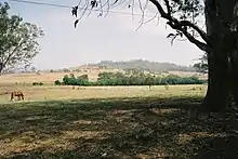 The house looks across the fields to the north to a line of hills where a small vineyard was established ('Plantation Hill'). It is here that, after a trip to Wollongong where he had been given seeds, Hassall planted some cabbage tree palms (Livistona australis) and others which he described as those of a "silver tree". The palms are gone today and were unusual in the district.[6] NB: In 2001 Plantation Hill is bushy now - the cabbage palms are gone, although a "silver tree" does remain, suckering from its base). To the north-west and above an area of African olives was a clearing planted with a "native vineyard" of native vines, a botanical collection, which is of interest to the Royal Botanic Gardens, Sydney.[10][1]