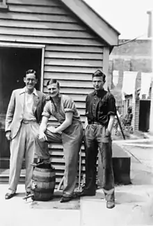Left to right: Ian Milner, Denis Glover, and Robert William Lowry at the 'Dog-box', St Elmos flats, Christchurch. Taken by an unidentified photographer in December 1933.