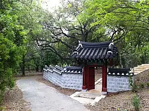 Notably, the park contains a "gift from South Korea to the people of San Antonio",[2] in the form of a Korean pavilion similar in design to the Gwangju Democracy Bell, in Gwangju South Korea. The pavilion (which reflects the traditional Korean methods of construction) was designed to "facilitate business and cultural friendships" between the two cities of Gwangju, South Korea and San Antonio, TX, USA. The two cities are sister cities. Architects were Yu Chang Byung and Hong Hee Lee, and the Korean firm Namkwang Construction Co., have been involved with the $1.2 million project, since its inception. The City of Kwangju provided half of those funds, while Namkwang Construction Co. also contributed to the project.[3]