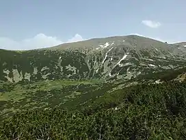 Deno (Bulgarian: Дено) is a peak in the eastern part of the Rila Mountain in southwestern Bulgaria. It is 2,790 m high and is the fourth highest summit in the mountain range behind Musala (2,925 m), Malka Musala (2,902 m) and Irechek (2,852 m).[1][2] It is built up of gneiss and granite–gneiss. The northern slope is steep, while the southern one is oblique and covered in grass. A deep gully descends along the north-western slopes that holds perennial firn.[2] To the west is situated the valley of the Musala Bistritsa, a tributary of Bulgaria's longest river, the Iskar and Musala refuge; to the north-east is situated the Saragyol Cirque that contains three glacial lakes.[2][3] Deno is located in the vicinity of the ski runs of Borovets and the cabin lift to Yastrebots refuge, which make it easily accessible. In winter some of the tourist tracks are exposed to avalanches.[2]